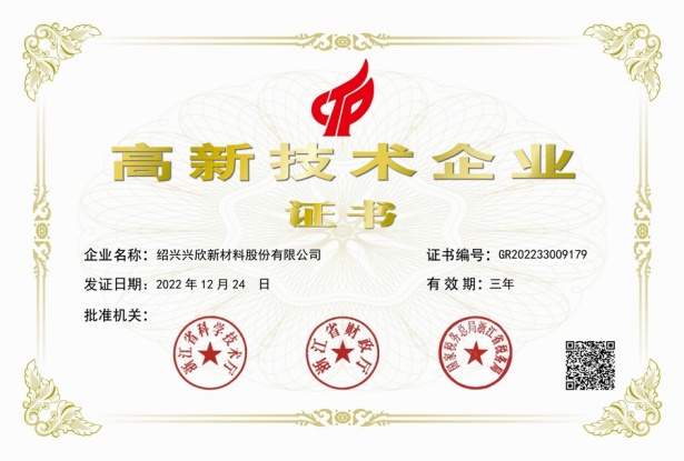 紹興興欣新材料股份有限公司成立于2002年06月27日,占地面積122畝,位于杭州灣上虞經(jīng)濟技術開發(fā)區(qū)拓展路2號,現(xiàn)有職工200余人,專業(yè)技術人員50余人;博士、碩士研究生30余人組成的一支知識型、專業(yè)化的技術科研團隊。公司面向全球市場,專業(yè)開發(fā)電子化學品、環(huán)?;瘜W品、醫(yī)藥中間體、高分子材料等先進新材料重點領域的省級科技型企業(yè);建有浙江上虞、安徽東至兩個生產基地。目前為“國家高新技術企業(yè)”、浙江省“隱形冠軍”企業(yè)、浙江省專精特新中小企業(yè);建有“省級”研究開發(fā)中心,共建天津大學浙江紹興研究院電子化學品研發(fā)中心。